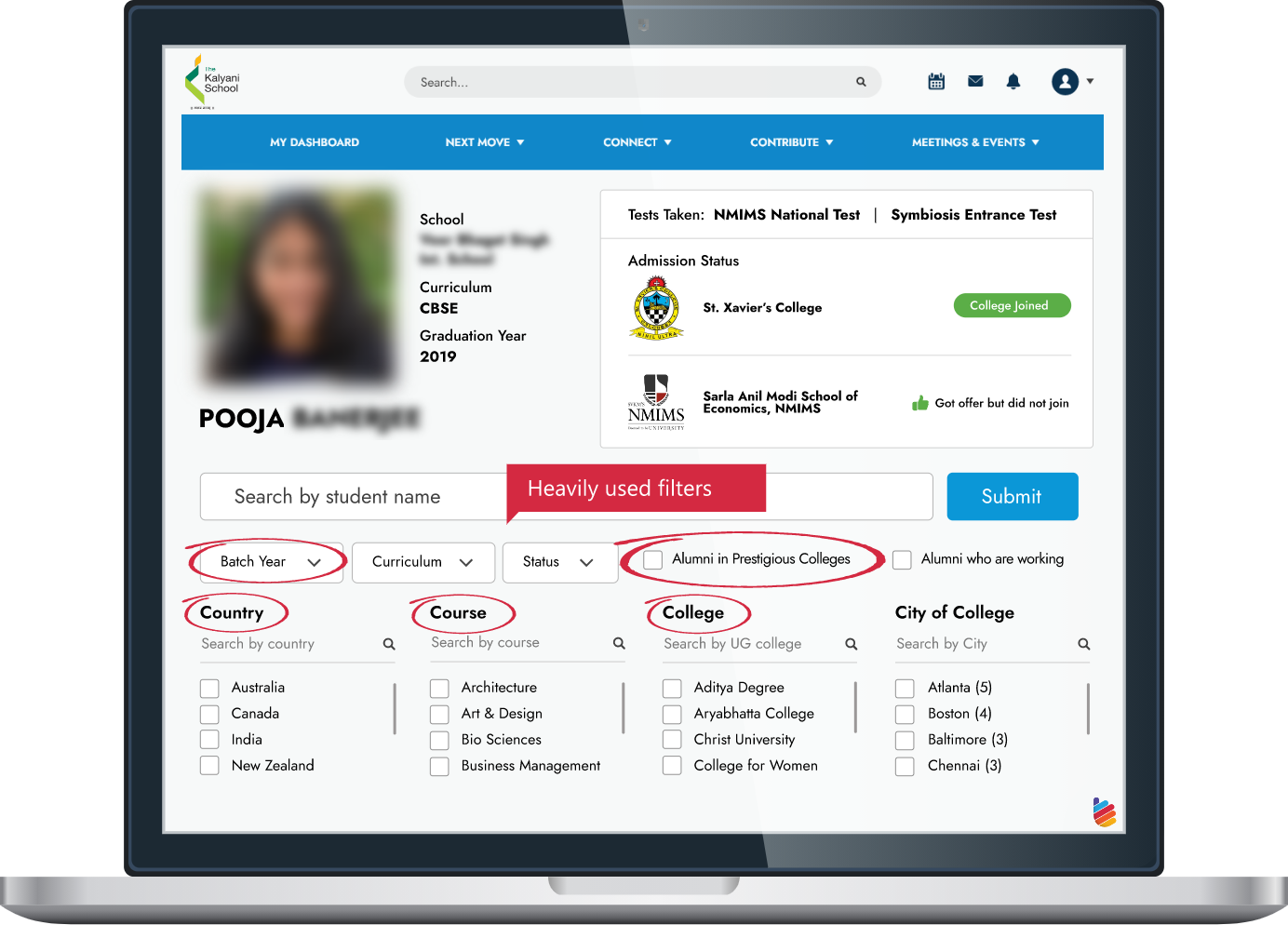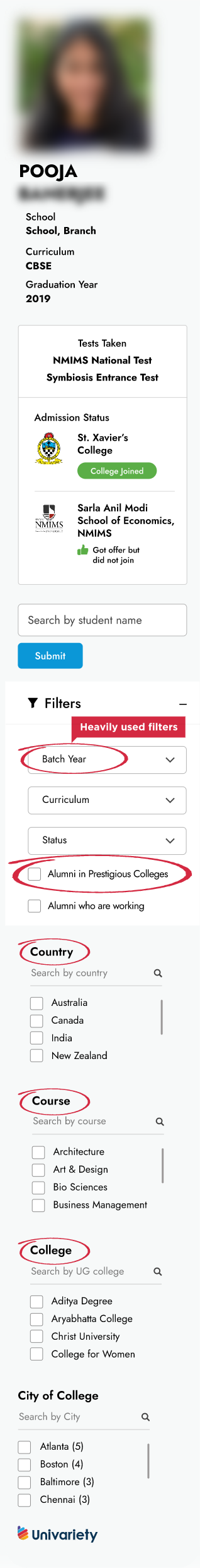 Right from entrance exams taken to colleges applied and admitted to, students can view their alumni journeys. The unique platform enables students to filter by interest and view thousands of alumni profiles.
